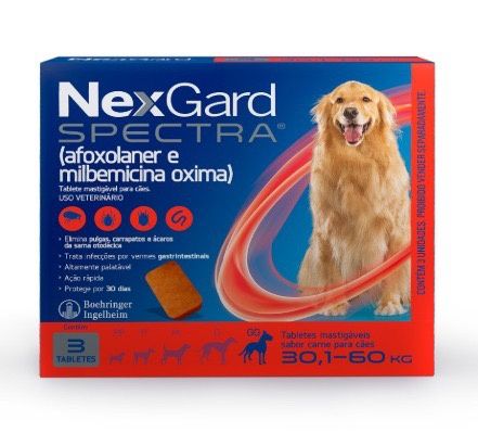 Uma solução completa contra parasitas em um delicioso tablete mensal sabor carne. É um e pronto!  Facilite a proteção contra parasitas. Proteja seu cão contra pulgas, carrapatos, ácaro e vermes intestinais com apenas um saboroso tablete mastigável mensal de NexGard SPECTRA®!